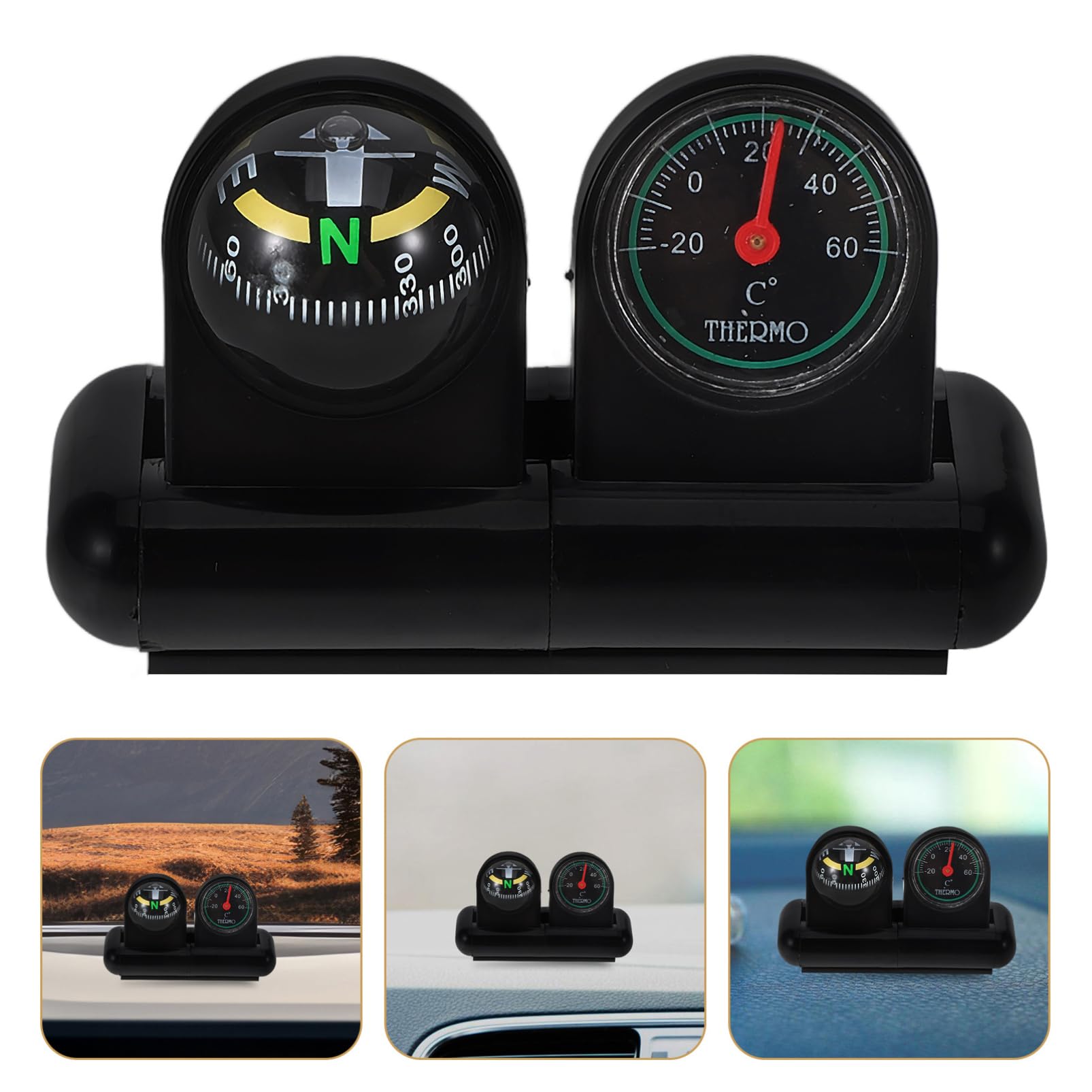 Designed with a clear and easy-to-read display, it helps you stay aware of direction and cabin temperature during long drives or outdoor trips. The strong adhesive base ensures secure placement on the dashboard without damaging the surface.